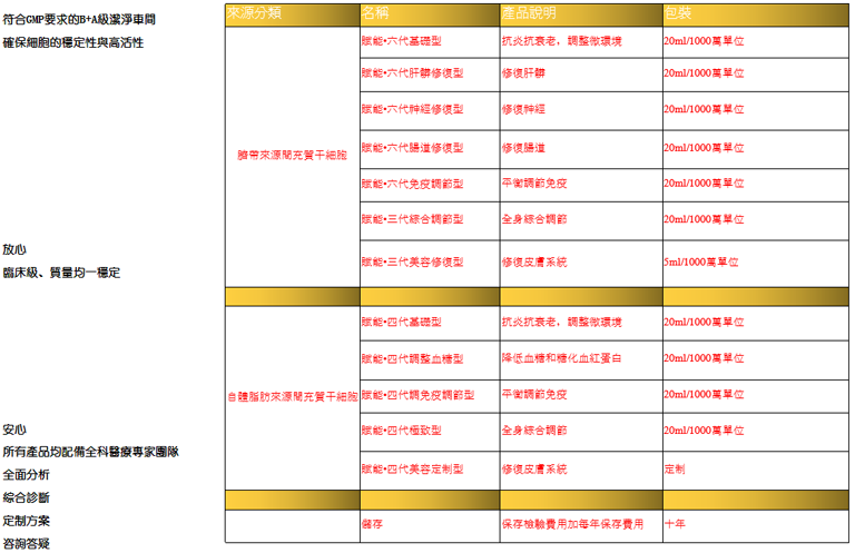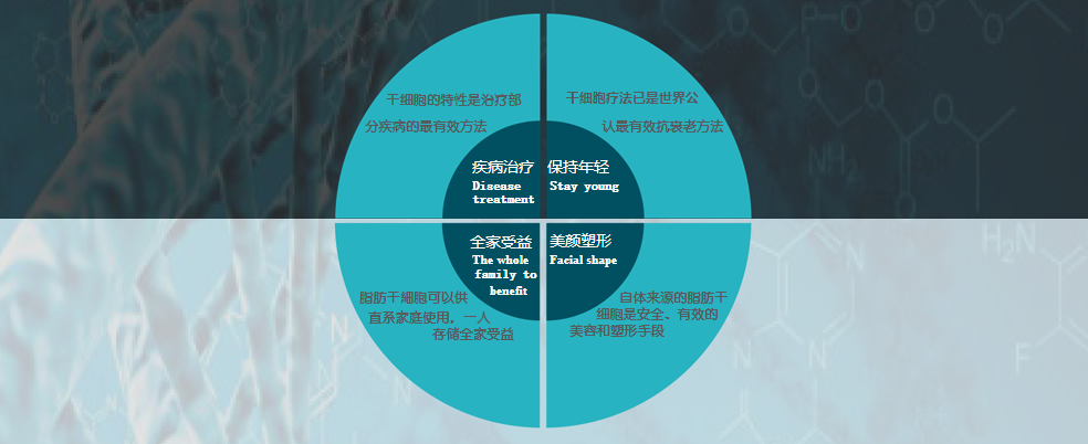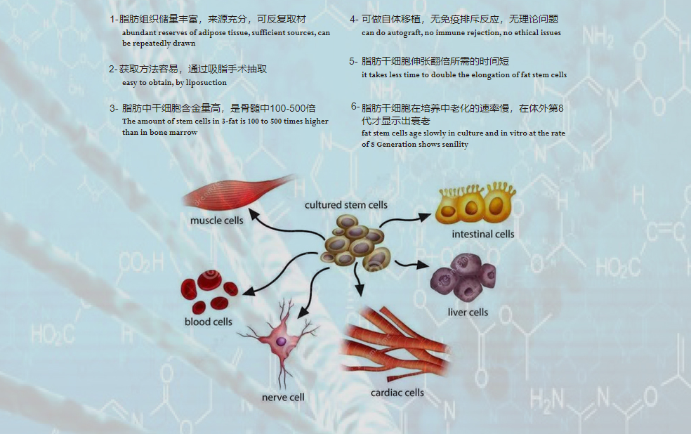 Adipose stem cells (adipose derived stem cells, ADSCs), refers to a kind of isolated from adipose tissue with multi-directional differentiation potential of stem cells. Its source is rich, easy to obtain, and the ability of proliferation differentiation is strong, in vivo or in vitro specific conditions, can differentiate into nerve cells, vascular endothelial cells, cardiomyocytes, liver parenchymal cells, chondrocytes, muscle cells.With the unique patented technology, only 100ML of fat is needed to obtain sufficient number of stem cells for storage, culture and amplification for self-use. |