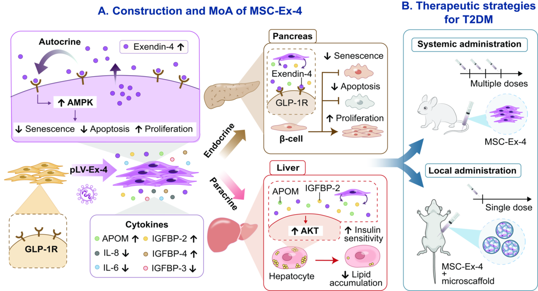 (A)通过慢病毒转导系统构建Exendin-4基因工程MSCs (MSC-Ex-4),在不断释放Exendin-4的同时可对APOM、IGFBP2等蛋白因子分泌进行调节。其中,MSC-Ex-4分泌的Exendin-4可通过自分泌与自身的GLP-1R相互作用延长其在高糖应激下的抗逆能力。同时MSC-Ex-4分泌的其他活性因子可通过内分泌作用保护胰腺β细胞,通过旁分泌作用改善肝细胞胰岛素敏感性,减少肝细胞脂质积累。