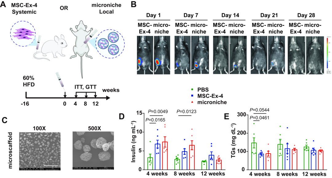 而血清胰岛素、甘油三酯(TGs)水平以及葡萄糖耐量等指标也显示该微载体作为细胞药剂可增强MSC-Ex-4治疗效果达两个月以上。