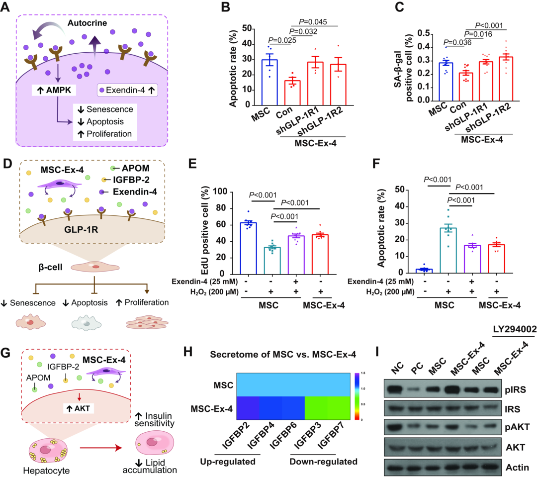 进一步研究证实,这种能力得益于MSC-Ex-4自分泌的Exenidn-4配体结合了自身表达的GLP-1R受体并激活下游的AMPK信号通路,从而促进了细胞增殖,并且显著增强了抗凋亡及抵抗衰老能力。