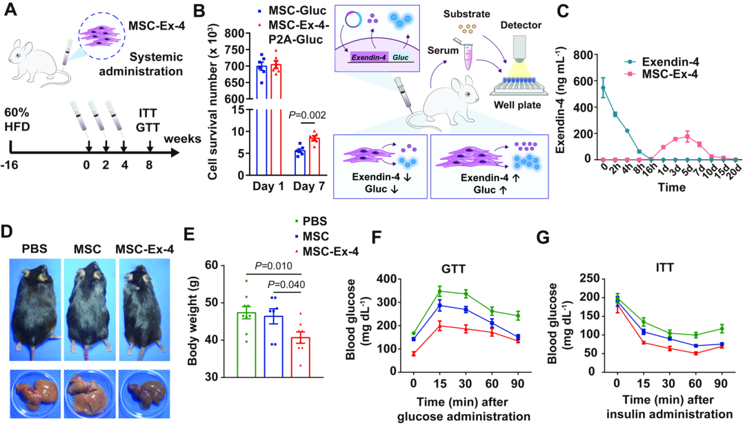 在高脂饮食诱导的小鼠T2DM模型中,通过追踪尾静脉注射后的MSCs,发现MSC-Ex-4在注射一周后的存活数量相较于未修饰对照组提高了40%。