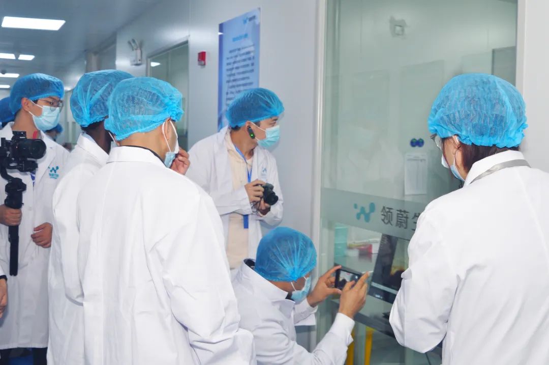 首先,采访团来到了领蔚生物干细胞高标准GMP实验室,这里是专业研发人员和科学家的“实战场”,也是细胞培育的“生产车间”,采访团详细询问了“生产车间”的情况,陈啸罕先生表示,细胞的培养和生产制备非常重要,对环境和技术的要求也非常高,质量控制体系越严格,产品质量才会更好。目前,领蔚生物的GMP实验室洁净程度已经达到药品级别,无菌的工业设计实现了药品化的整个闭环。采访团对领蔚生物质量控制和研发技术表现出了浓厚的兴趣,并高度肯定了领蔚生物的科研实力。看到实验人员正在制备细胞,采访团纷纷拍照点赞。陈啸罕先生介绍,这些细胞是由脐带干细胞和脂肪干细胞提取,将被用于各种疾病的调节及抗衰保健、美容服务等领域。